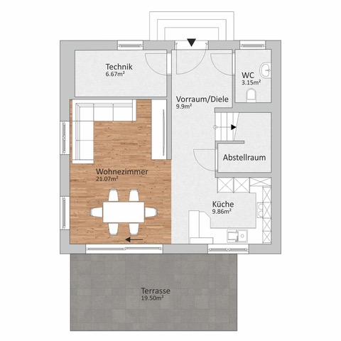 Über den Vorraum ist das große Wohnzimmer mit der integrierten offenen Küche zu erreichen. Vom Vorzimmer aus erreichen Sie auch das WC und den Technikraum.
