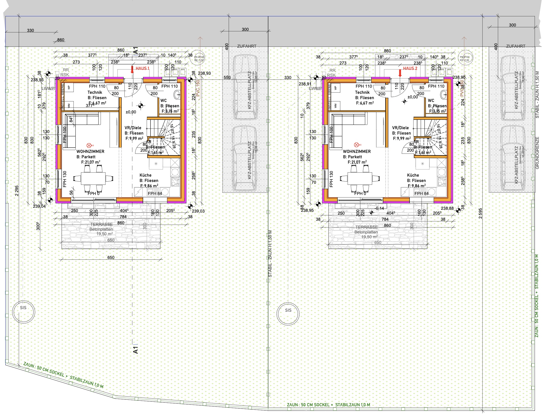 52,35 m2 mit Terrasse 19,5 m2 und 2 KFZ Stellplätze mit je 15m2 50,84 m2